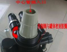 5、將控制器的下布水器口對正中心管,壓下,使中心管插入控制閥承插口中,小心地沿順時針方向轉(zhuǎn)動控制器,(注意:安裝控制閥的過程中,一定要確保中心管插入閥體)直至控制閥旋緊在罐體接口上。控制器與罐體之間是由控制器配戴的橡膠圈密封的,不要在控制器螺紋上纏繞其他密封材料。