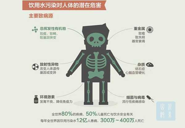 此外,據(jù)世界衛(wèi)生組織報(bào)道,由于飲用不良水質(zhì)而導(dǎo)致的消化道疾病、傳染病、結(jié)石、皮膚病、癌癥、婦科炎癥等疾病達(dá)50多種,現(xiàn)代醫(yī)學(xué)證明,人類 死亡原因有80%是由于環(huán)境污染、各種有害物質(zhì)在體內(nèi)存留所造成的,而各種有害物質(zhì)進(jìn)入體內(nèi)不被正常排出,有80%的疾病是飲用水造成。